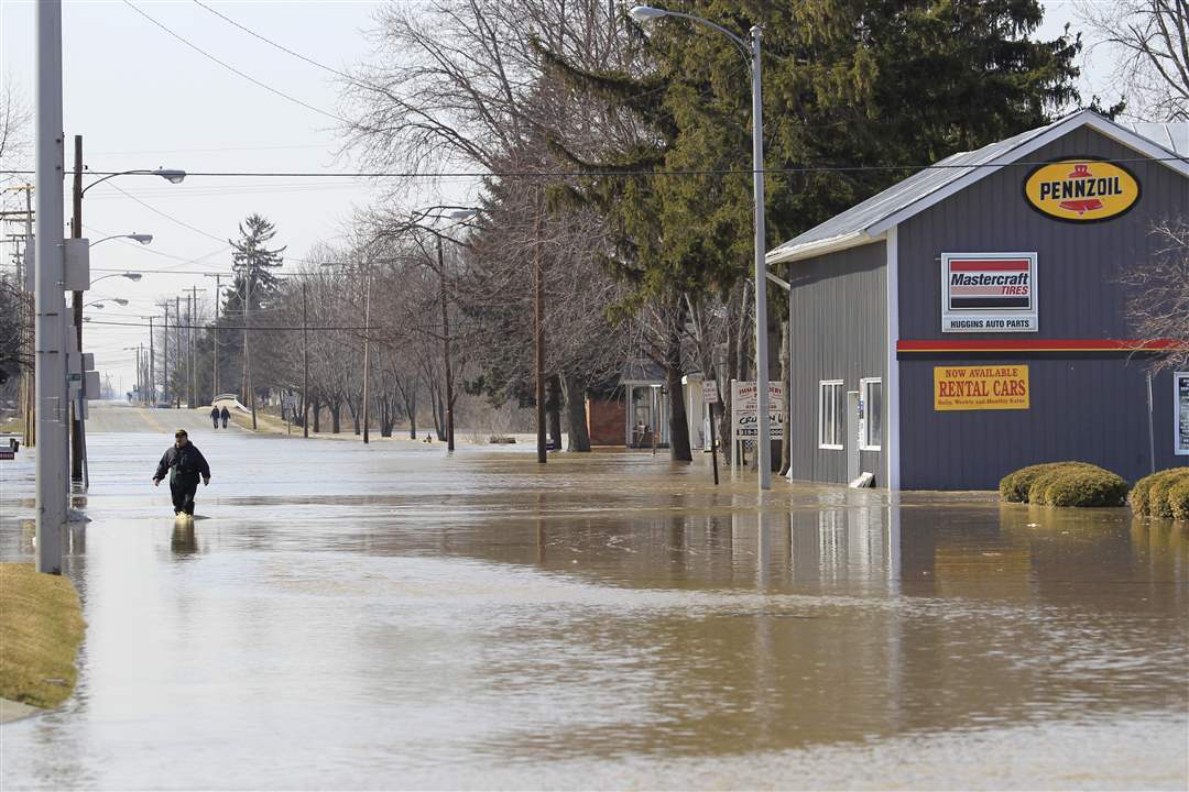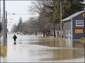 Nick Amador walks through flood water from the Blanchard River on Route 224 in Ottawa, Ohio, Tuesday, March 1, 2011. He said his basement was flooded and wanted to remove a water heater but had to get a part from a nearby hardware store.