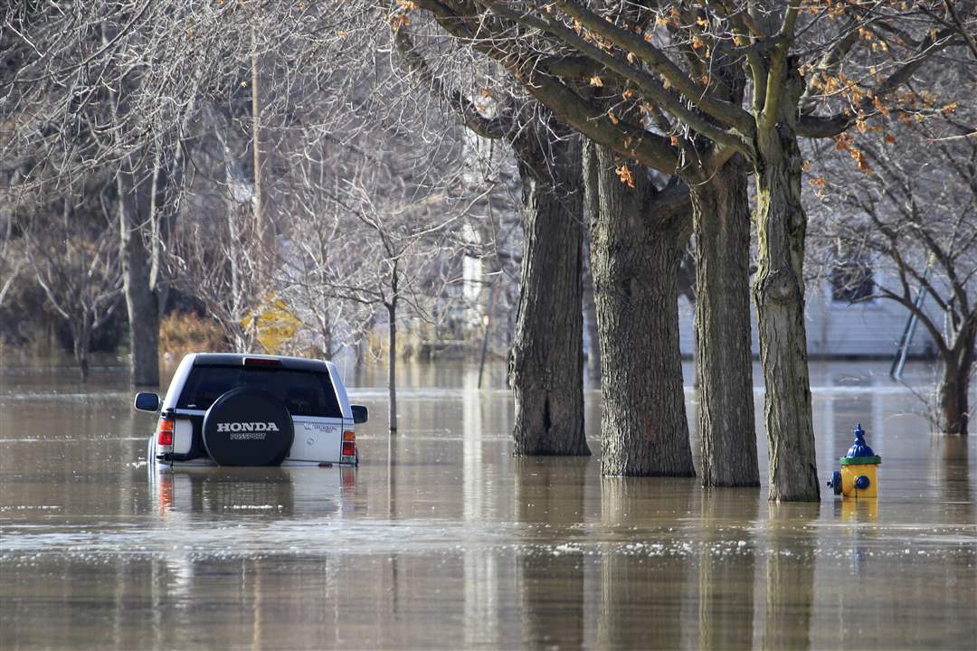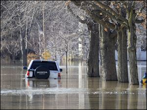 A parked car is submerged in flood water from the Blanchard River on East Third Street near Perry Street in Ottawa, Ohio, Tuesday, March 1, 2011.