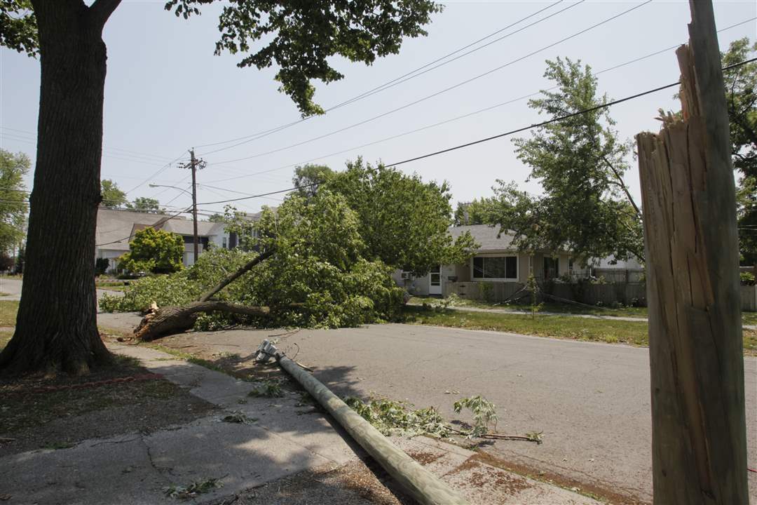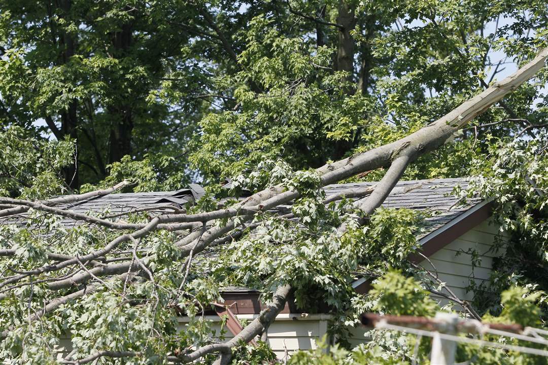 Casey Essinger [not pictured] is concerned as a damaged branch continues to pull down a line in the front of his house. Casey Essinger and his mom spent over 20 minutes in a windowless bathroom as the storm ripped through their Byal Avenue house, damaging their roof and causing rainwater to collect inside.