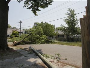 Jim Barger, of Tiffin, a contractor for Time-Warner, removes a tree branch from lines on Byal at Tappan Street in south Findlay. The area is without power.
