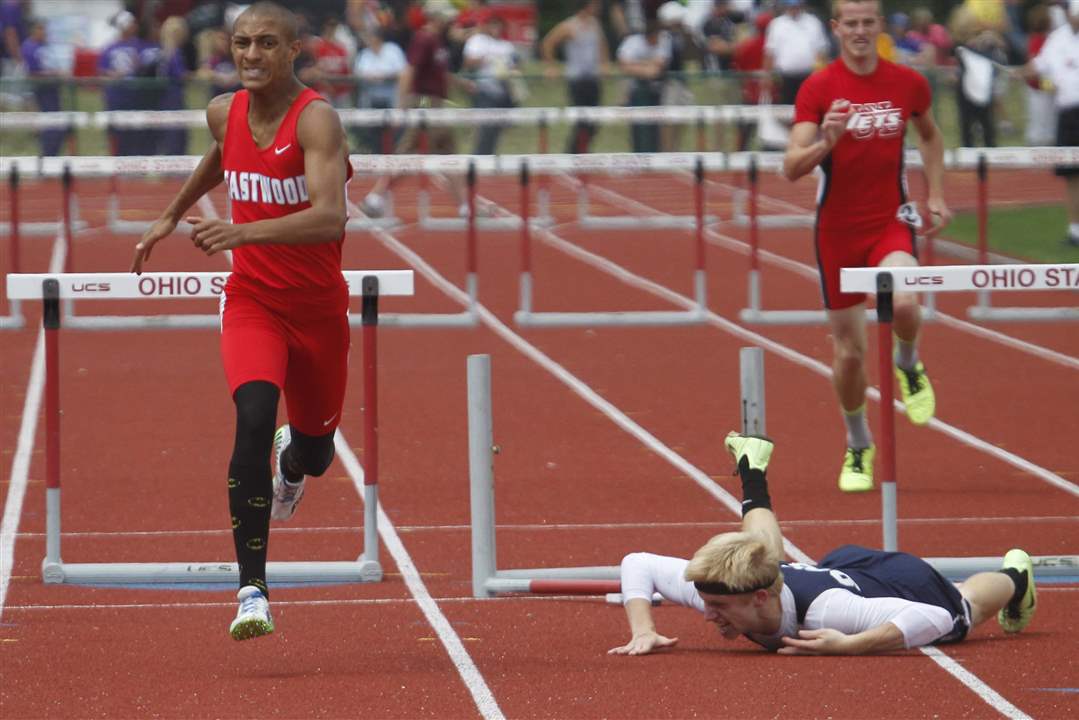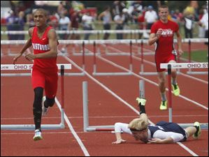 Pemberville's Devin Snowden runs in the 300 meter hurdles. Falling at right is Clinton Campbell, of McConnelsville Morgan.
