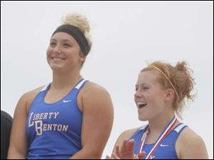Liberty-Benton's Alex DeVincentis, left, and Liz Streaker stand on the podium to collect their 1st and 3rd medals, respectively, in the discus throw.