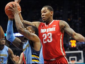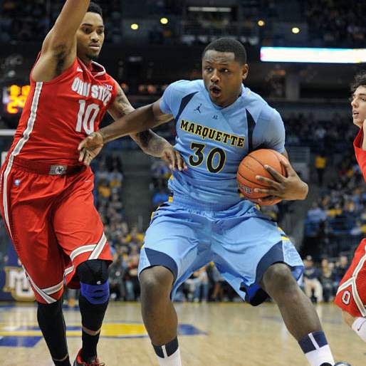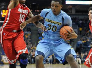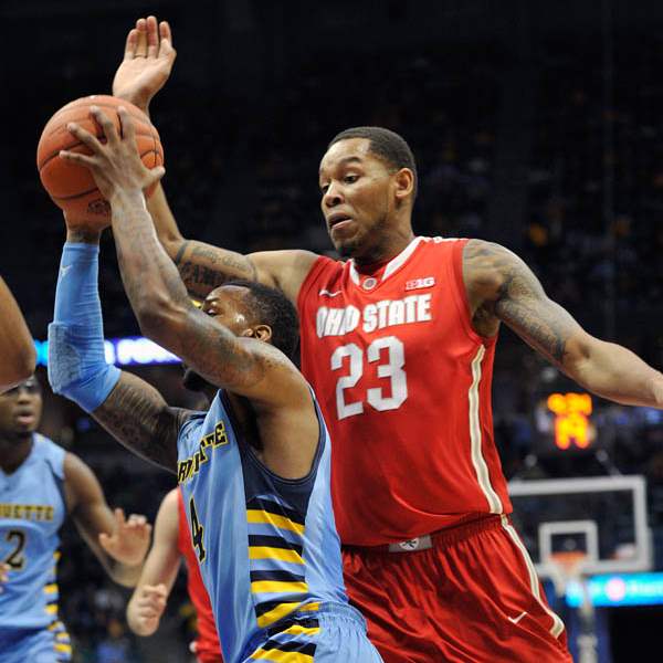 Marquette's 's Todd Mayo, left, drives to the basket as Ohio State's' Amir Williams (23) defends during the first half.