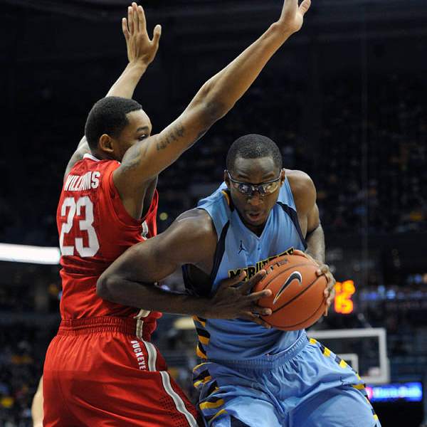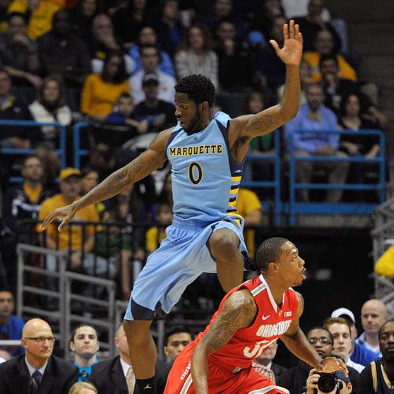 Marquette's Jamil Wilson (0) flies through the air trying to block the shot of Ohio State's' Lenzelle Smith Jr.