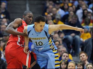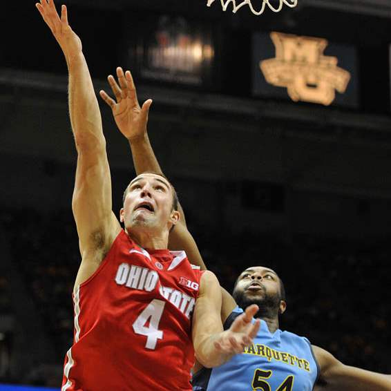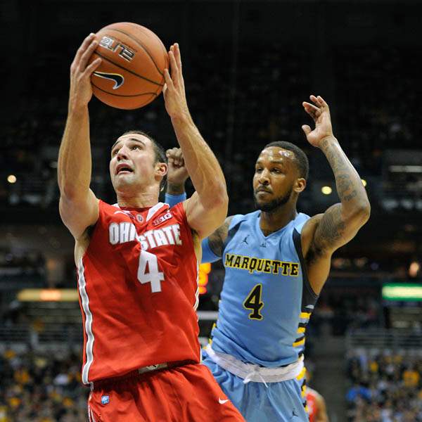 Ohio State's' Aaron Craft (4) drives to the basket past Marquette's 's Todd Mayo (4) during the second half.