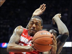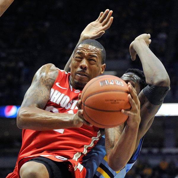 Ohio State's' LaQuinton Ross (10) defends as Marquette's 's Deonte Burton (30) drives to the basket during the first half.