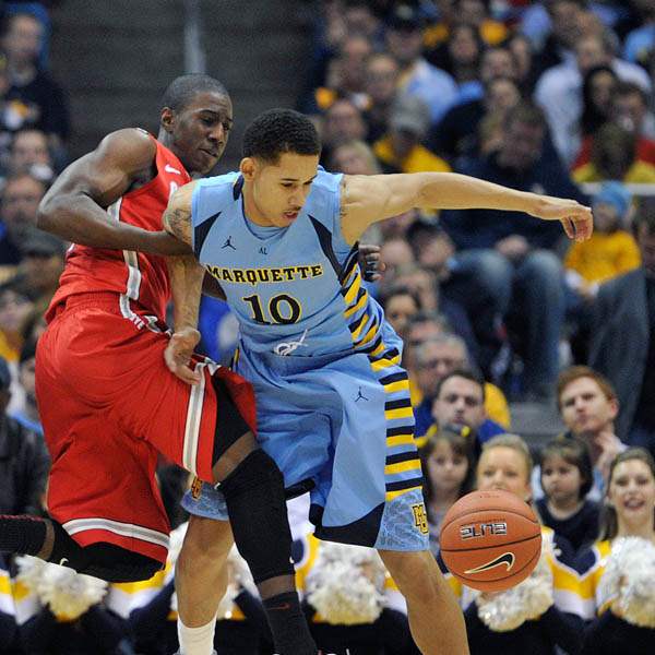 Ohio State's' Shannon Scott left, and Marquette's Juan Anderson (10) fight for the ball during the first half.
