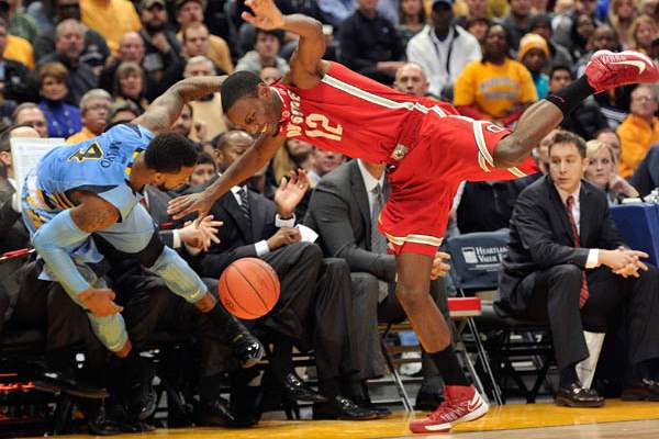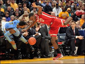 Marquette's 's Todd Mayo (4) and Ohio State's' Sam Thompson (12) collide as the ball goes out-of-bounds during the first half.