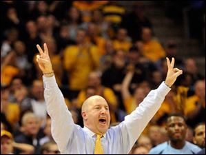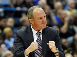 Ohio State head coach Thad Matta yells out to his team as they play Marquette during the first half.