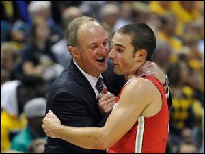 Ohio State head coach Thad Matta, left, smiles as he hugs Aaron Craft during the second half.