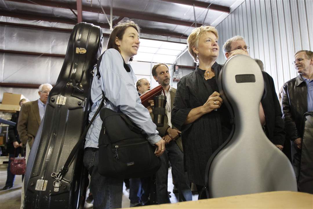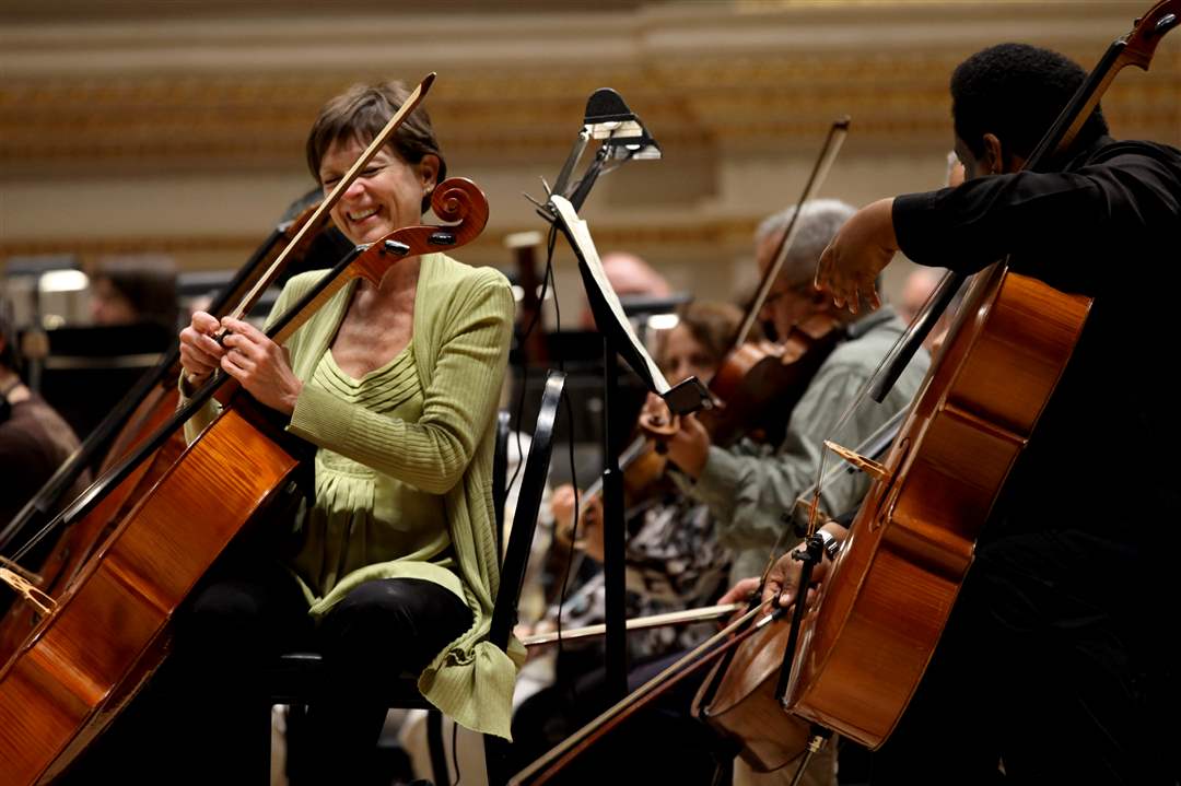 Cello player Martha Reikow shares a light moment with fellow musician Damon Coleman, right, as members of the Toledo Symphony prepare during a rehearsal for their performance at Carnegie Hall in New York.