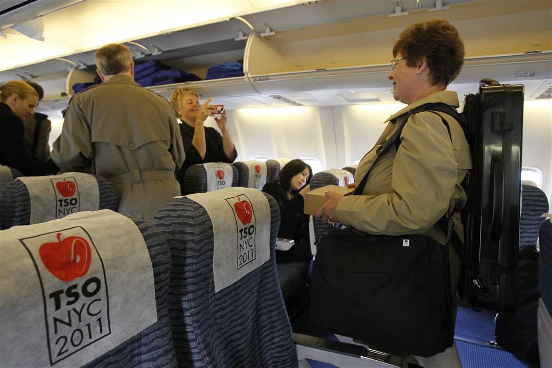 Nora Schrankin, a bassoon player, carries her instrument securely as she makes her way to her seat on the plane that is bound for New York City and Carnegie Hall.