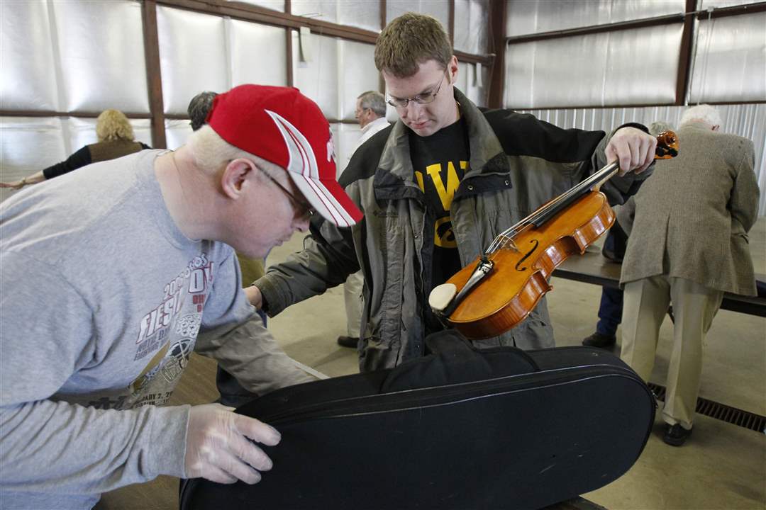 Tim Zeithamel, a viola player with the Toledo Symphony Orchestra, has his instrument case checked by a TSA security officer before boarding a plane at Toledo Express Airport on Friday
