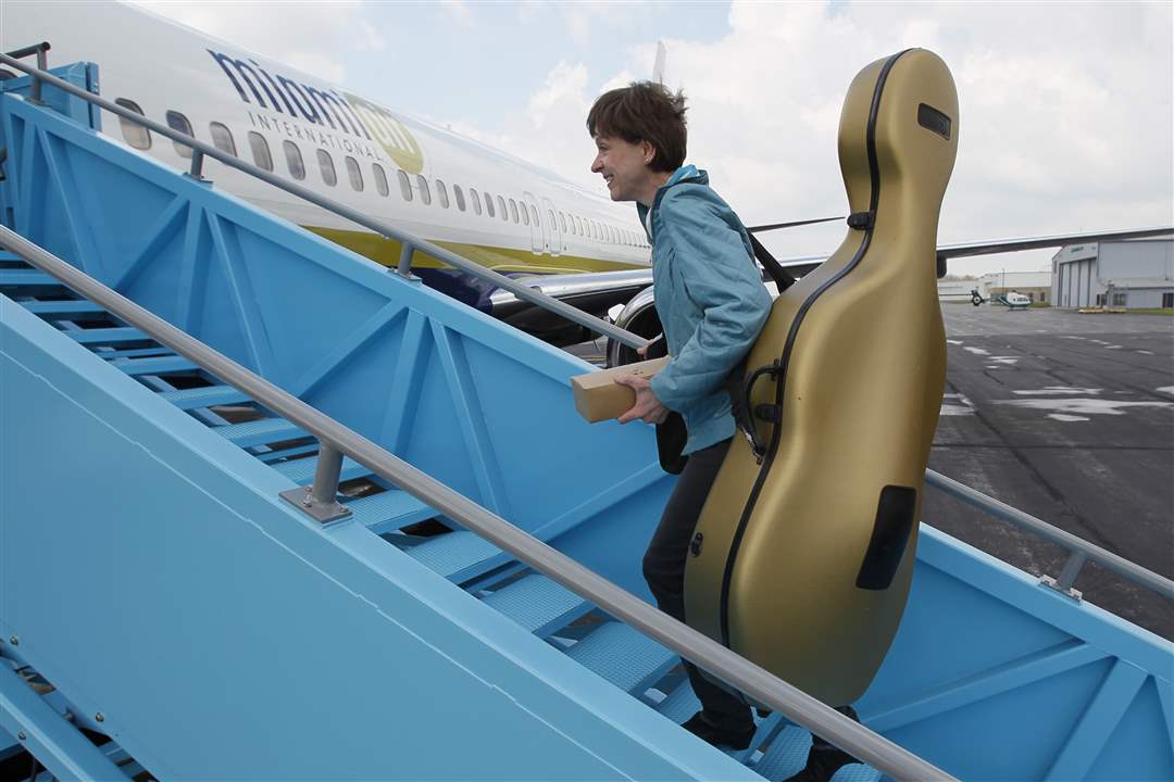 Martha Reikon, principal cellist with the Toledo Symphony Orchestra, boards a plane at Toledo Express Airport.