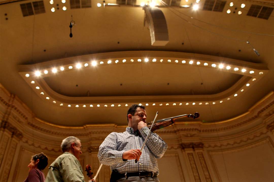 Violinist Vasile Chinto an prepares for rehearsal inside Carnegie Hall.