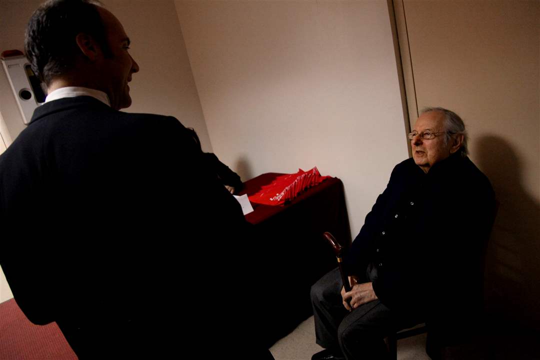 Symphony double bassist Derek Weller, left, and pianist, conductor, and composer Andre Previn chat at the stage door in Carnegie Hall.