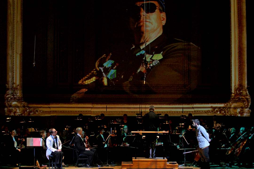 From left, actors Benjamin Pryor and Pete Cross perform ‘Every Good Boy Deserves Favour,’ a Cold War-themed political play, accompanied by the Toledo Symphony at Carnegie Hall.