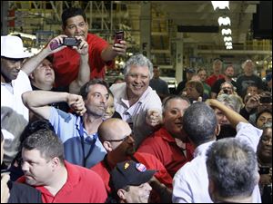 President Obama greets the crowd during his visit to the Jeep Wrangler plant at Chrysler Group LLC's Toledo Assembly complex on Friday.