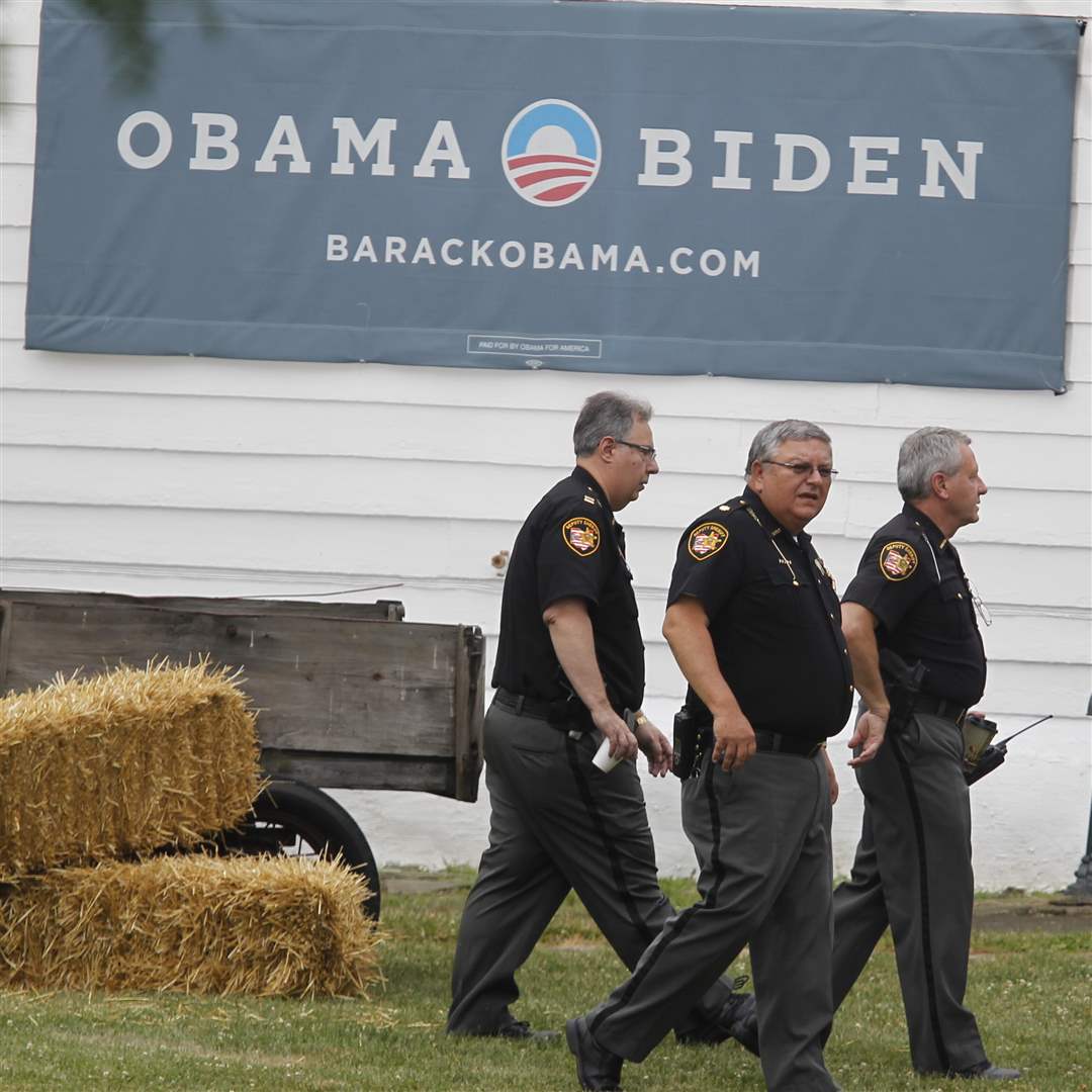 Ohio Highway Patrol troopers gather before the president's plane arrives at the airport.