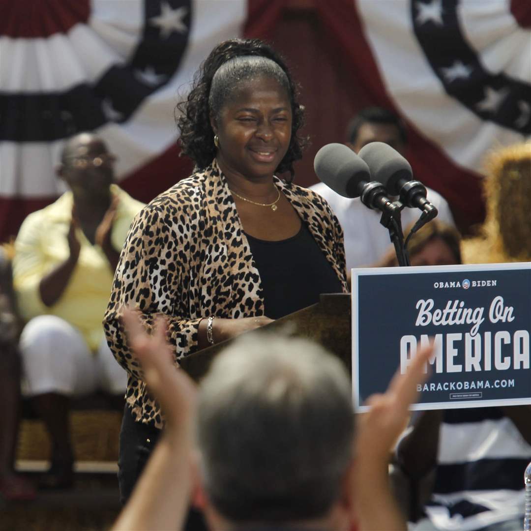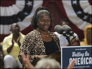 Ina Sidney, a Chrysler plant worker, is applauded during her speech. She also introduced President Barack Obama.