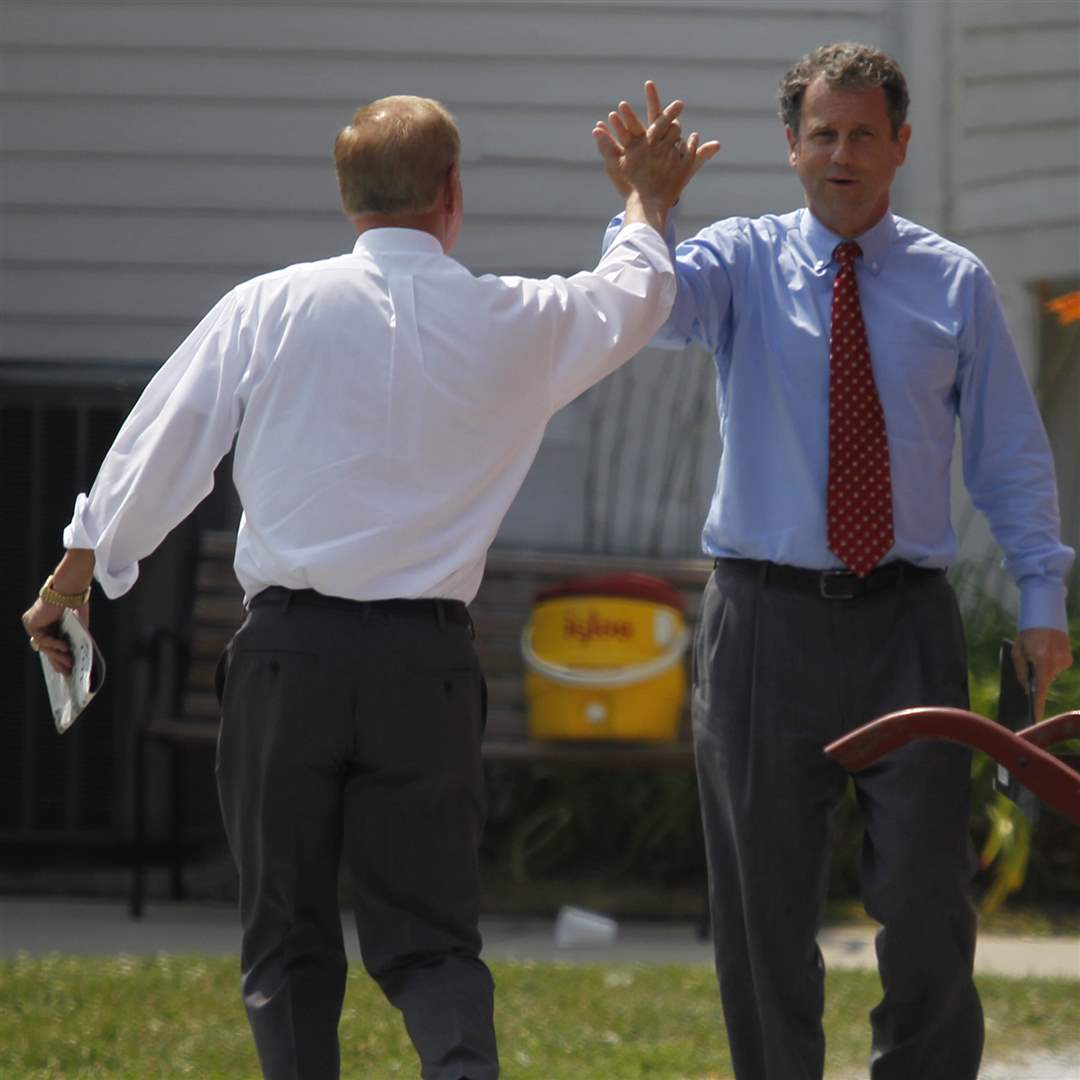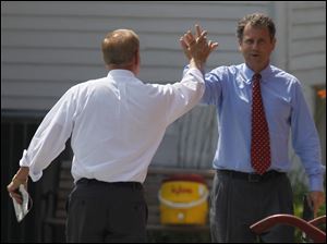 Former Ohio governor Ted Strickland, left, and Senator Sherrod Brown high-five.