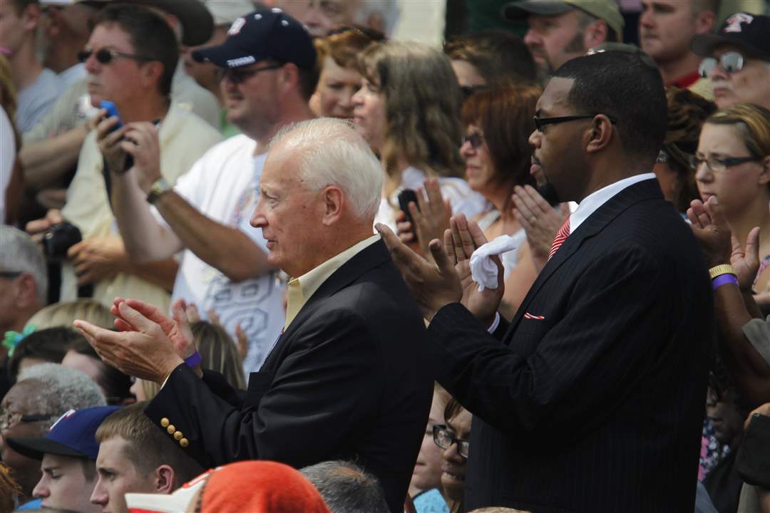 Former Toledo mayor Carty Finkbeiner applaudes.