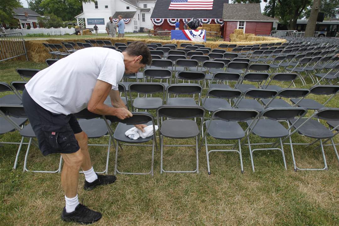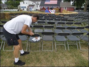Stage hand Mike Pelechaty, of Toledo, wipes rain off seats.
