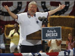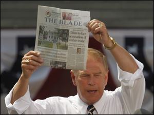 Former Ohio governor Ted Strickland holds up a Toledo Blade newspaper.