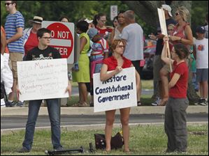 Protestors stand across the Anthony Wayne Trail prior to President Barack Obama's speech.