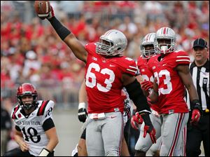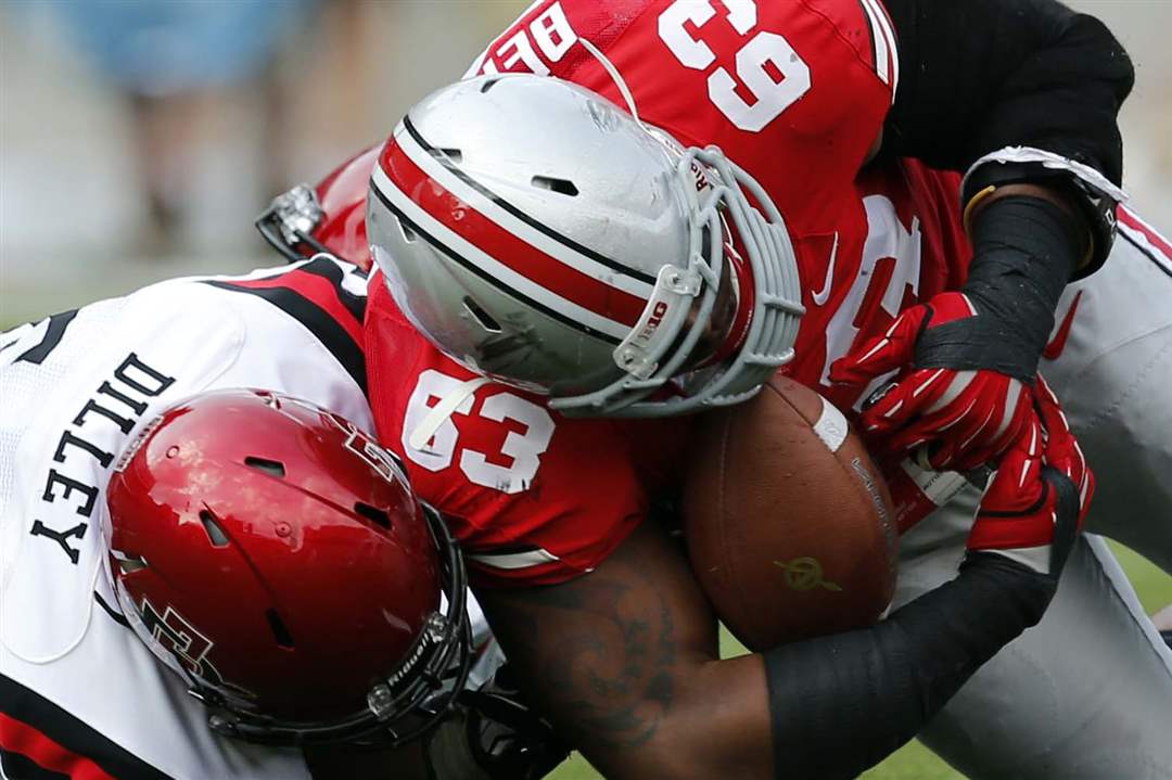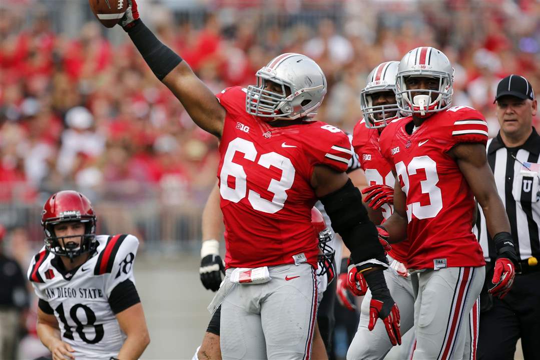 Ohio State DT Michael Bennett (63) recovers a fumble against San Diego State during the second quarter.