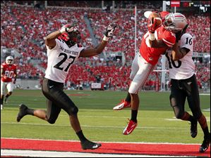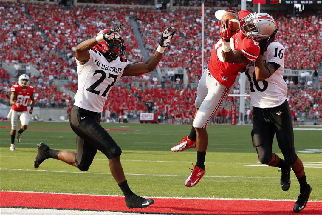 Ohio State WR Corey Brown (10) makes a catch for a touchdown against San Diego State defenders David Lamar (16) and Eric Pinkins (27) during the third quarter.