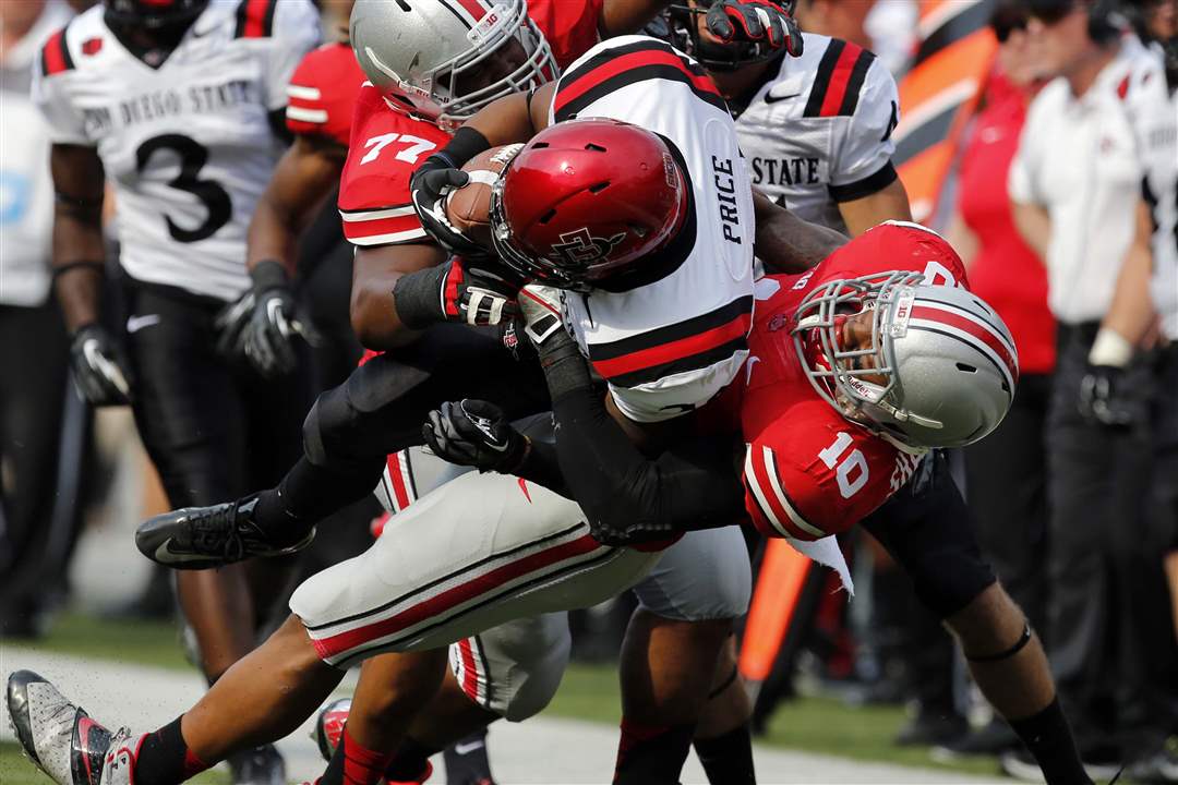Ohio State defenders Michael Hall (77) and Ryan Shazier (10) bring down San Diego State RB Chase Price (22) during the second quarter.