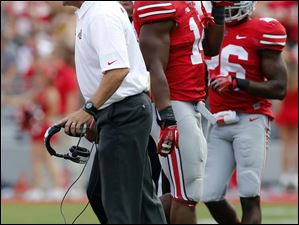 Ohio State head coach Urban Meyer is upset over a clipping penalty against San Diego State during the fourth quarter.