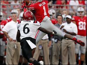 Ohio State H Dontre Wilson (1) makes a catch against San Diego State defender Gabe Lemon (6) during the third quarter.