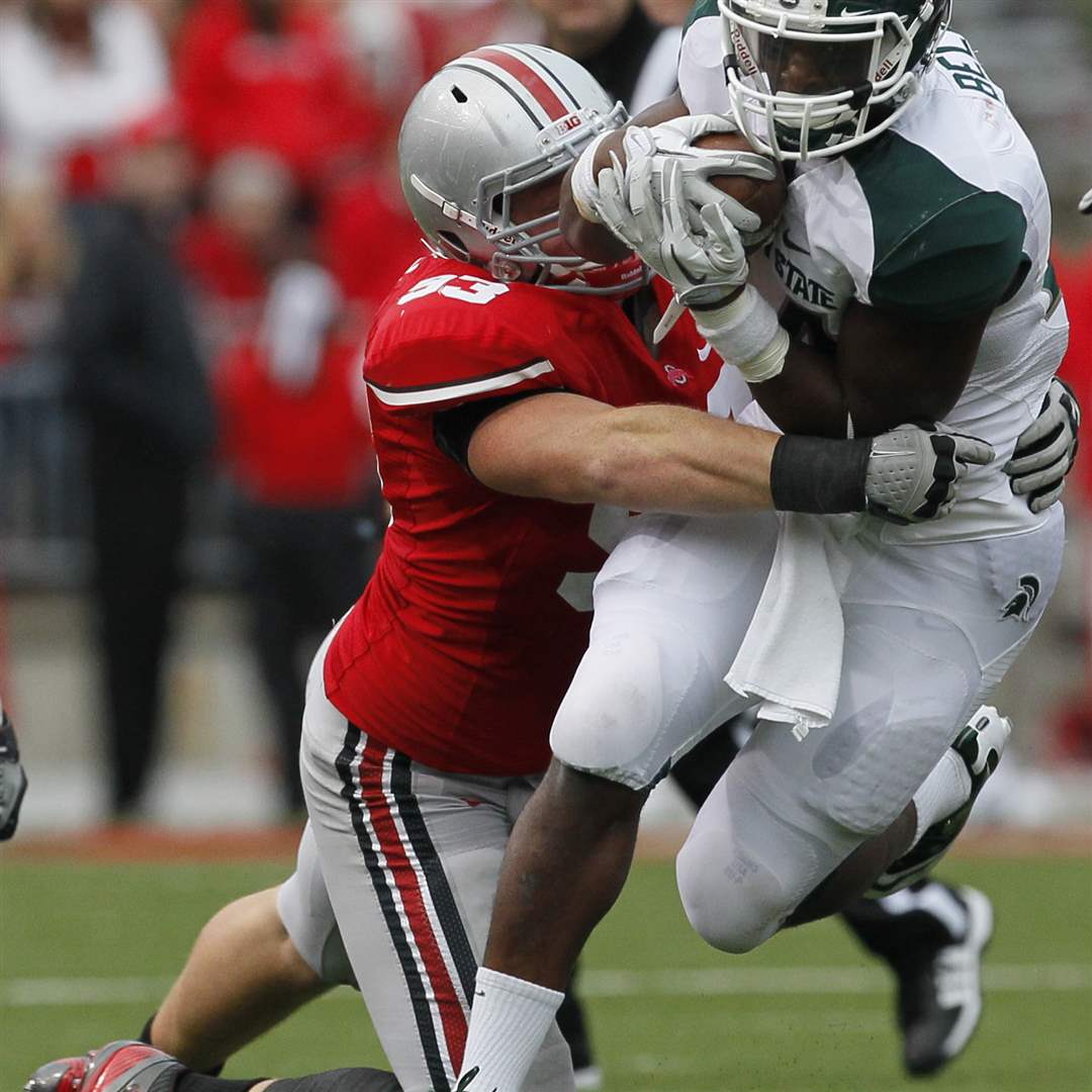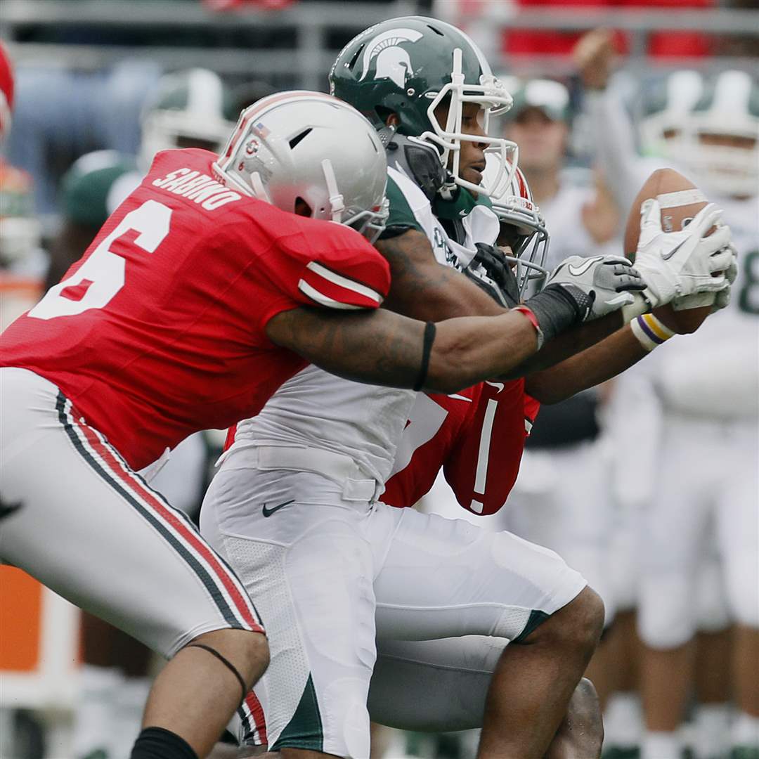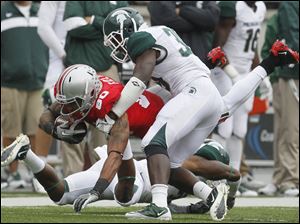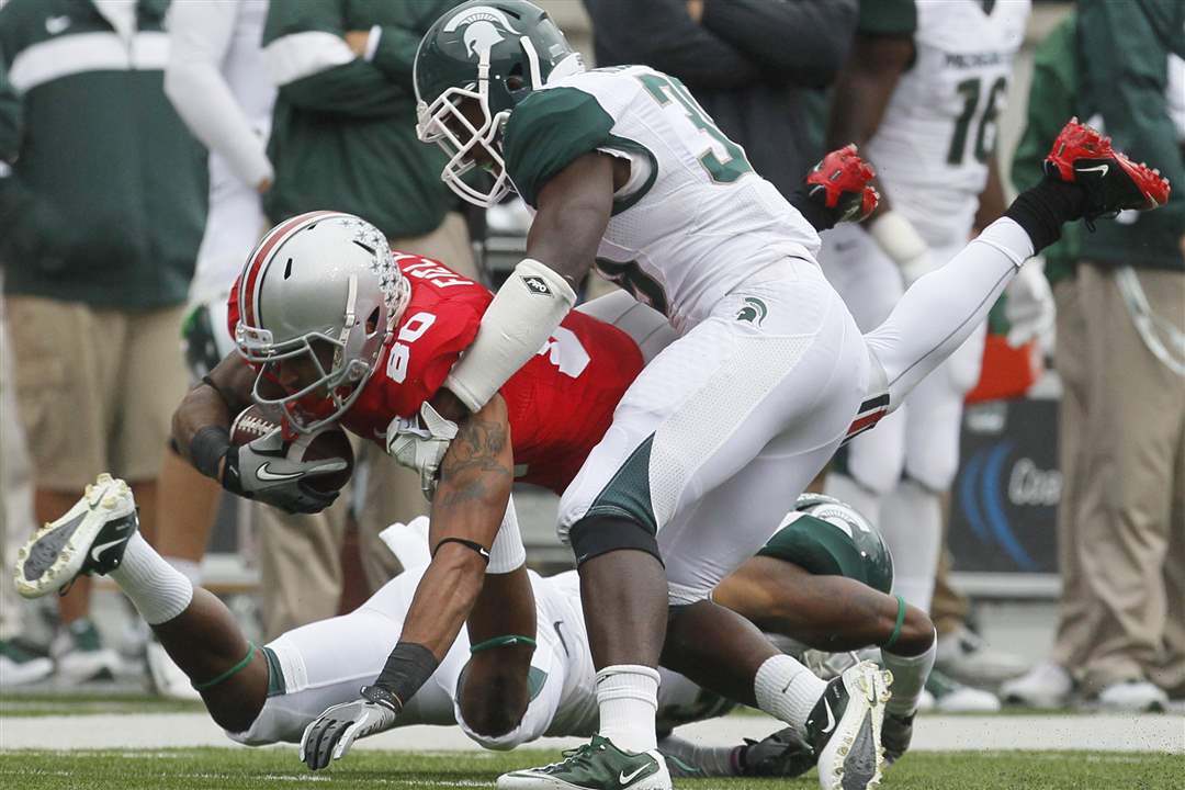 Michigan State WR B.J. Cunningham (3) makes a catch for a first down against Ohio State defenders Etienne Sabino (6) and Travis Howard (7) during the second quarter.