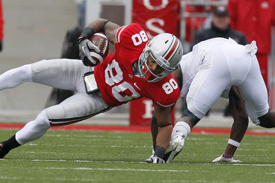Ohio State WR Chris Field (80) makes a catch against Michigan State SS Isaiah Lewis (9) during the first quarter Saturday.