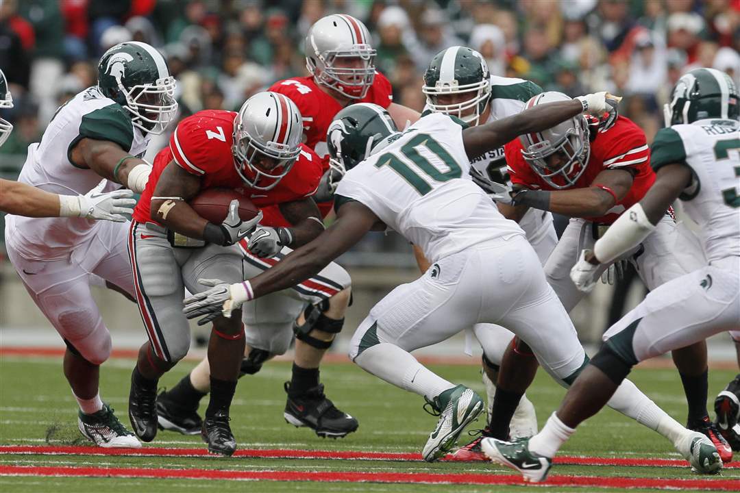 Ohio State TB Jordan Hall (7) runs the ball against Michigan State during the third quarter Saturday.