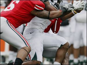 Ohio State QB Braxton Miller (5) is sacked by the Michigan State defense during the second quarter Saturday.