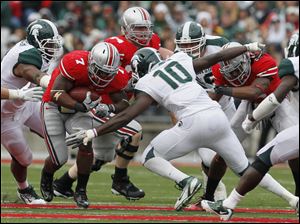 Ohio State TB Carlos Hyde (34) is knocked out of bounds by Michigan State FS Trenton Robinson (39) during the first quarter Saturday.