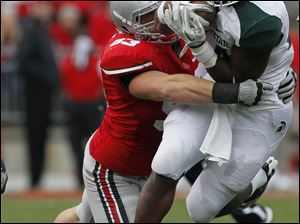 Michigan State WR Keith Nichol (7) makes a catch against Ohio State LB Andrew Sweat (42) during the second quarter Saturday.