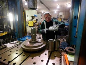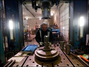Daniel Tenney, an employee with Toledo Metal Spinning, works to make a steel blender cup.