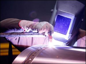 Mark Dusseau, an employee with Toledo Metal Spinning, works to make a steel beer fermentor.