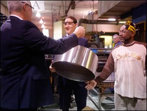 Eric Fankhauser, left, vice president of Toledo Metal Spinning, Ohio Treasurer Josh Mandel, center, and Carlos Robinson, right, an employee of 8 years, look at the top of a car wash vacuum top that the company makes during a tour.