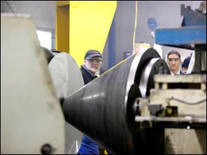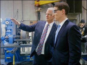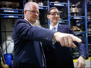 Eric Fankhauser, left, vice president of Toledo Metal Spinning, gives Ohio Treasurer Josh Mandel, right, a tour of the company Monday.