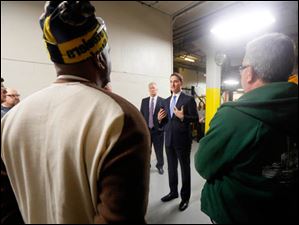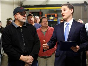 Ohio Treasurer Josh Mandel, center, speaks with employees of Toledo Metal Spinning after handing out the first "Ohio Strong" award Monday.