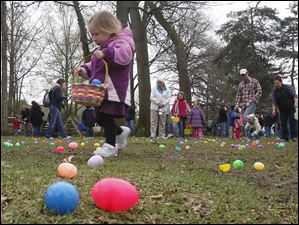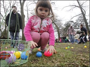 Gabriella Fugazzi, 3, picks up eggs during the annual egg hunt at Olander Park in Sylvania, Ohio.