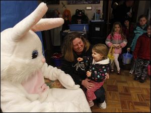 Arianna Estes, 1, with her mom Christine Estes, of Ottawa Lake, Mich., interacts with the Easter Bunny during the annual egg hunt at Olander Park in Sylvania.