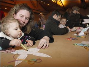 Arianna Estes, 1, gets coloring help from her mom Christine Estes, of Ottawa Lake, Mich., during the annual egg hunt at Olander Park in Sylvania.