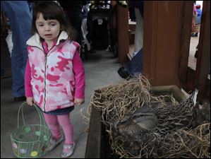 Gabriella Fugazzi, 3, watches a real duck sit on her own eggs during the annual egg hunt at Olander Park in Sylvania.