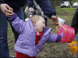 Layla Smith, 1, reaches into her basket for an egg during the annual egg hunt at Olander Park in Sylvania.